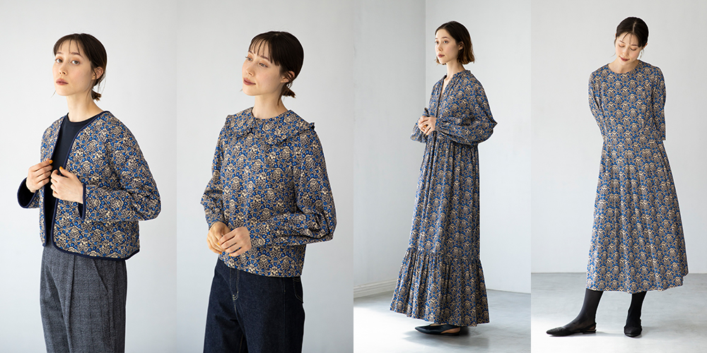 素材はオーガニックコットン100%のサテン地を使用しています。ハリ感がある素材で、サラリとした肌触りが心地よいシリーズ。こちらの柄でジャケット、ブラウス、ワンピース2型をご用意しました。