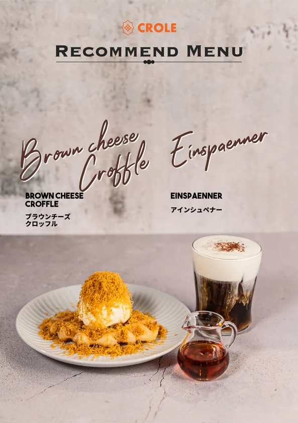 表面はサクッと中はふわふわもちもち食感、看板メニューは、発酵バターを使用したコクと風味豊かなクロッフルにバニラアイスを乗せてブラウンチーズを贅沢に振りかけた「ブラウンチーズクロッフル」、ほんのり甘さのあるキャラメル風味のブラウンチーズとバニラアイスにメープルシロップをかけて至福の一品!
