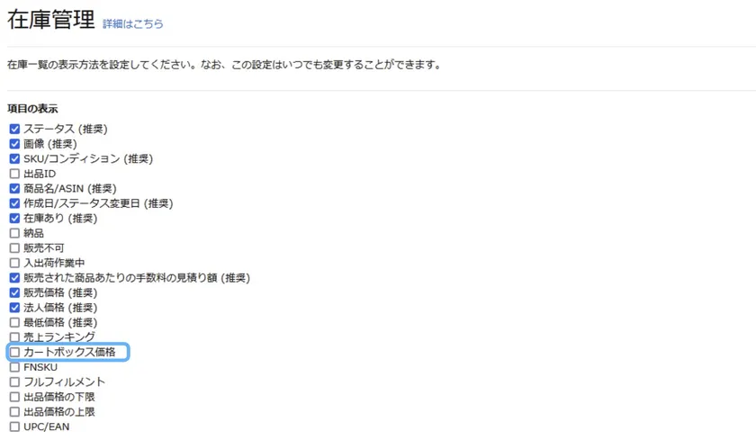 1. Amazonセラーセントラルで確認できます。[在庫管理]ページに入り、[カートボックス価格]を選択します。