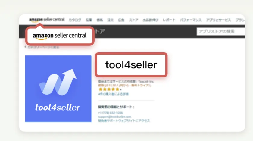 Tapcash Inc.により開発させたAmazonセラーツール「tool4seller(ツールフォーセラー)」とはAmazon公式認証済みマーケットプレイスアプリストアで掲載された総合ツール。