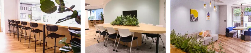 左:CAFEカウンター/中央:変形ミーティングテーブル/右:ミーティングスペース
