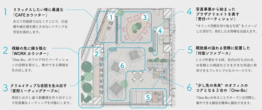 「One-Labo」は、総面積30.8坪(約101.9平方メートル)のポップアップショールームです。リラックスしたい時に最適な「CAFEカウンター」、クリエイティブな会話を生み出す「変形ミーティングテーブル」など、様々なシーンに合うスペースを「One-Bo」を中心に配置し仕切ることで、コンパクトでもABWを可能にする空間を実現しています。