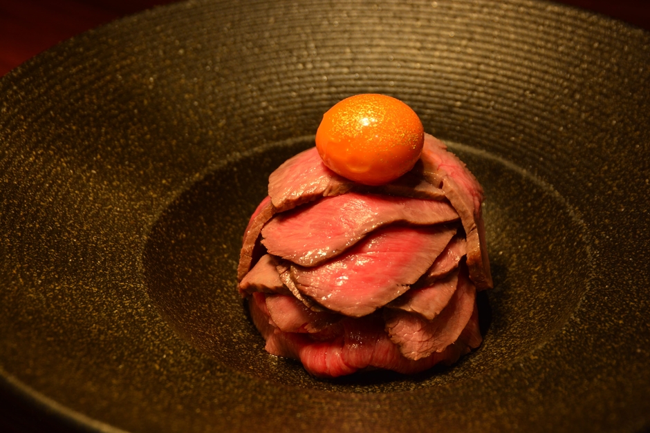 お肉がミルフィーユ状に美しく重なり合い仕上げに卵をのせたこの一品は