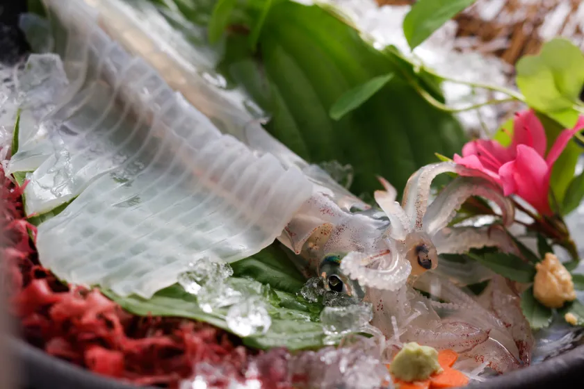 リニューアルした食事処にはオープンキッチンを新設し、その日水揚げがある魚や水槽の魚をお客様の目の前で捌いて提供。さらにオープンキッチン前には、その日おすすめの旬の素材が並び、魚を捌く臨場感を目の前で感じていただき、地元で消費される食材を見てもらうことで、特別な体験を通して魚食への理解を深めていただけます。9月4日までは、夏が旬の白イカを活きたままの状態でオープンキッチンを使い捌く「活イカプラン」を提供しています。