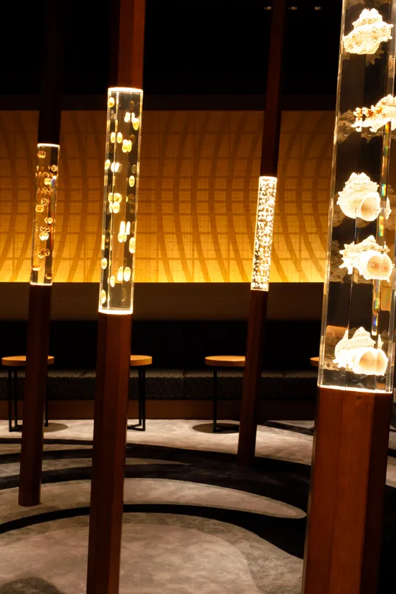 美しい自然豊かな香住をエントランスで表現。やわらかい光を放つ柱には、貝殻や松ぼっくりなど香住の自然の中で見られるものを宝石のようにアクリルに封入し、キラキラと輝きながらゲストをお迎えします。