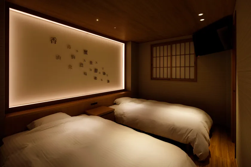 香住由来、さだ助由来の文字が踊る空間をコンセプトに、ほんの少しクスッと笑えるユーモアと上質感が交わるお部屋です。