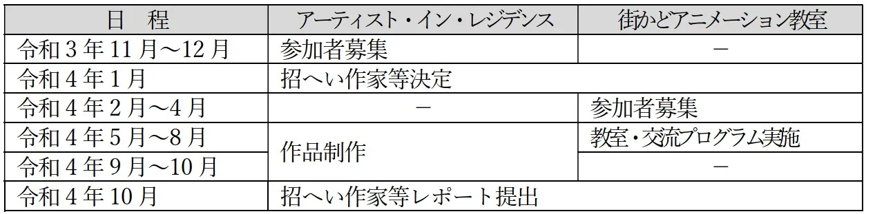 国内外のアニメーション作家、監督等(以下「招へい作家等」といいます。)を招き、広島広域都市圏内に長期間滞在し、制作活動を行ってもらうとともに、市民等と招へい作家等が交流する機会を作ります。