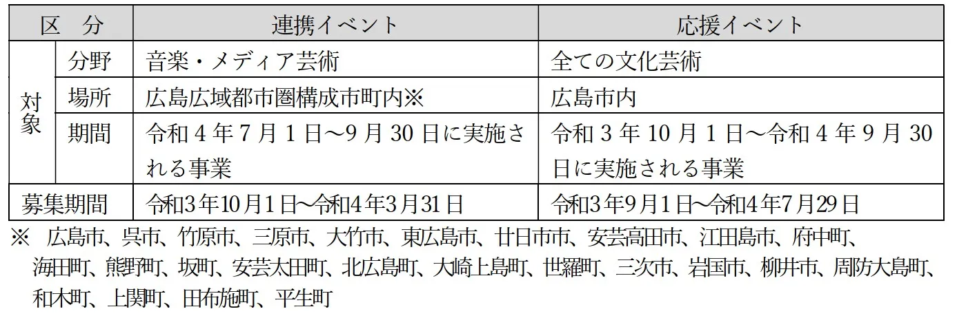 広島広域都市圏構成市町や他の文化関係団体が主催するイベントを連携事業と位置付け、相互に広報協力等を行うことで、文化芸術活動の振興を図ります。連携イベントは、ひろフェスの質の高さと独自性を確保するため、音楽とメディア芸術を対象とします。応援イベントは参加しやすさの観点から、全ての文化芸術分野を対象とします。