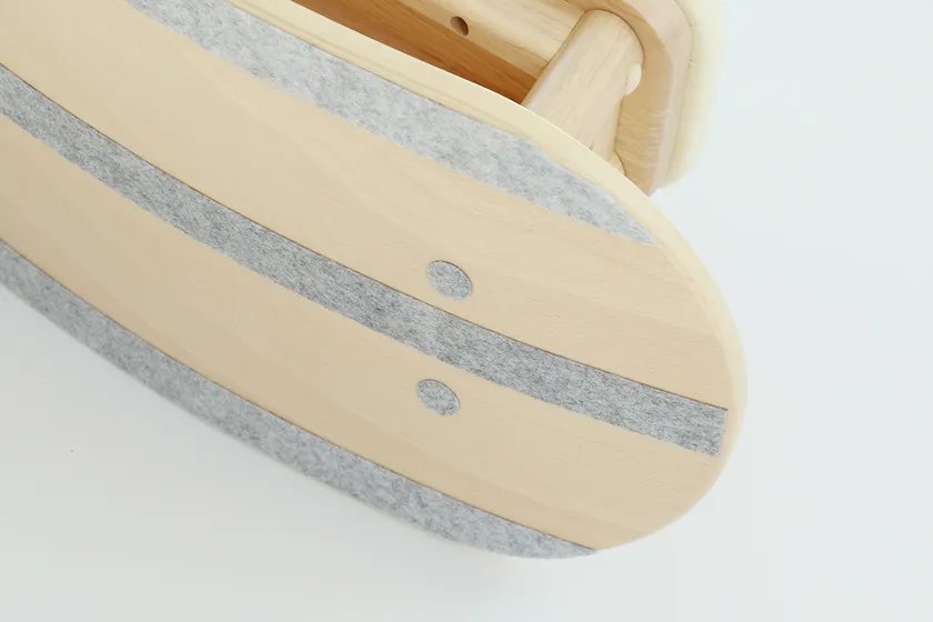 早速、社内のデザインチームで打ち合わせを行い、デザイン・開発に取り掛かりました。こだわった点は土台の板です。加工性に優れたラバーウッド材の積層合板をベースとし、表面材は数種類の木材で試作をし、強度と粘り気を兼ね備えたビーチ材を選出しました。また、最初の試作段階で一度社員のお子さんに使用してもらい、モニタリングの結果を踏まえて、ゆらゆらと揺れるときにしっかりと足裏が土台板に付くように幅を広く取り、転倒しにくいように設計しました。