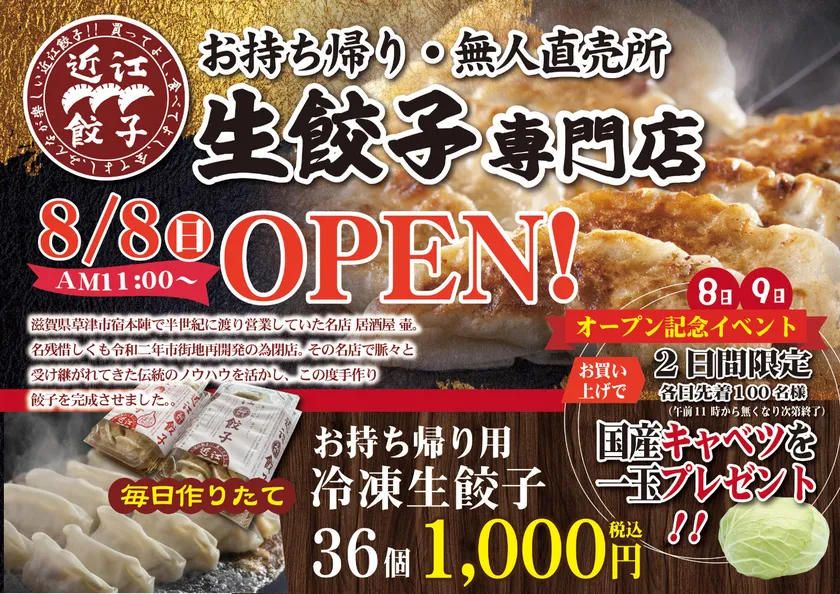 また、オープン記念として8月8日(日)・9日(月)の2日間は、【近江餃子】守山直売所でも大好評であった各日先着100名様限定で近江餃子を1,000円以上お買い上げの方に「国産キャベツ1玉プレゼント!!」キャンペーンを行います。※各日午前11時から無くなり次第イベントは終了