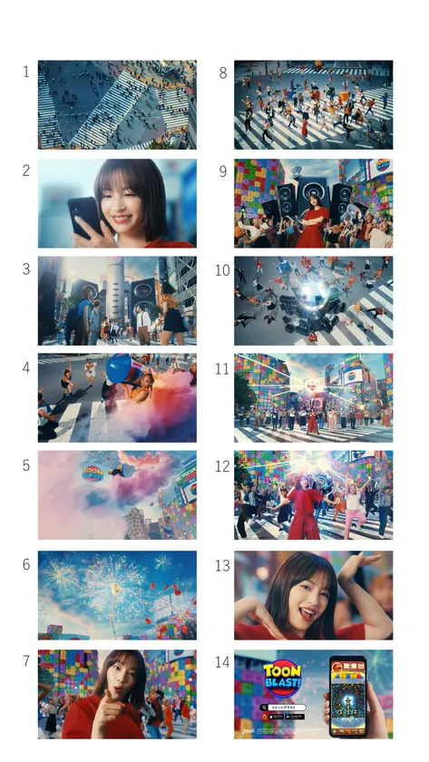 今作は渋谷の街が舞台となっており、広瀬さんを中心に「トゥーンブラスト」のゲームの中の様々な出来事が巻き起こります。まるで実際にゲームの世界に足を踏み入れたような感覚を味わうことができるCMとなりました。「トゥーンブラスト」のカラフルで爽快な世界観を表現した大迫力の演出と、広瀬さんのキュートな笑顔と仕草が存分に詰まった、見どころ満載の新CMにご注目ください。