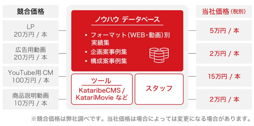 カタリベの強みは、安価でコンテンツ制作を可能にする、コスト低下ロジックとビジネスモデルがある点です。また、「広告」に特化することで、他社との差別化や競合優位性を構築しております。