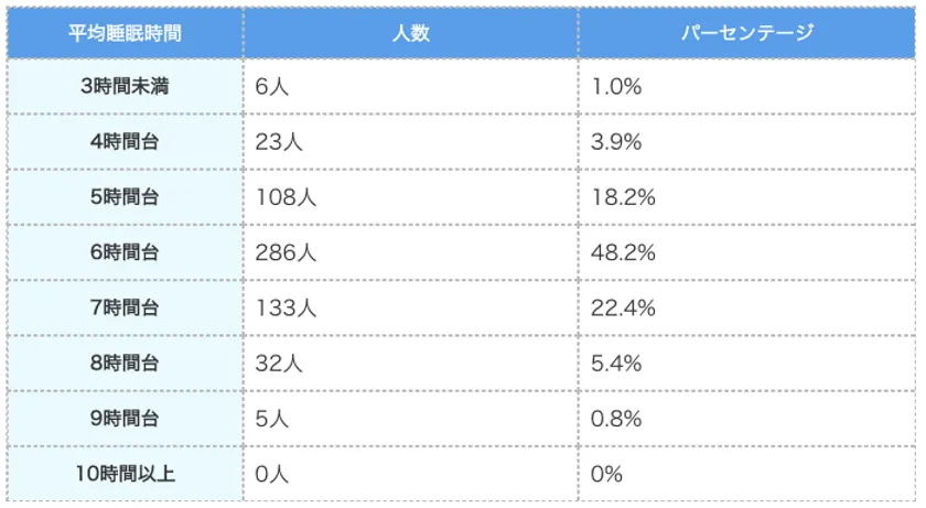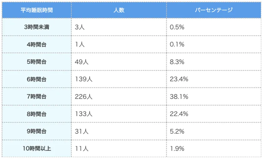 今回の社会人の平均睡眠時間に関する593名への調査により、主に次のことが分かりました。