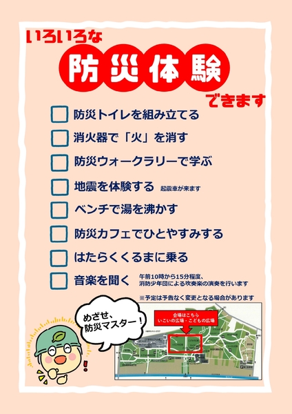 ポンプ車や救急車などの「はたらく車」がやってきたり、本物の消火器による「消火訓練体験」ができたりする、家族みんなで楽しみながら防災について学べるイベントとなります。その他にも、さまざまな防災コンテンツを企画中です。ぜひご家族で遊びに来てください!