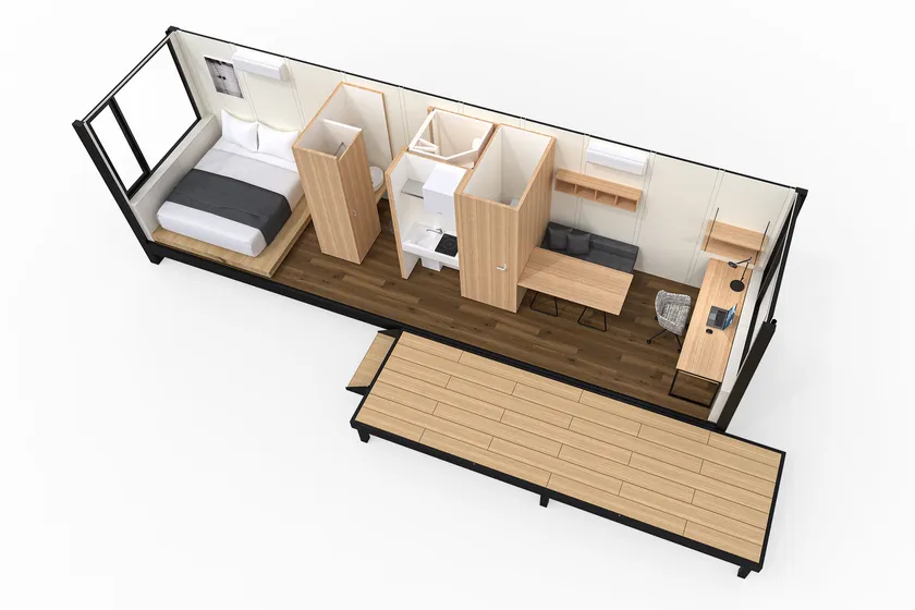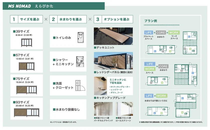 「MS NOMAD」は、「自分の好きな場所で、好きな時間に自由に働くこと」を手軽に実現できる製品パッケージです。“LIFE”…プライベートスペース “WORK”…ワークスペース “CORE”…水まわり の3つの機能を自由に選択し、組み合わせることで、様々な用途やひとりひとりの暮らしに合わせた生活空間を構成できます。