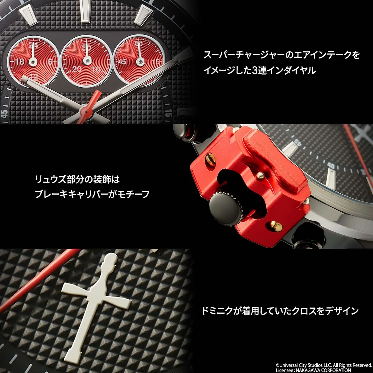 フロントグリル・メッシュ風の凹凸の文字盤の中央部には、ドミニクが着用しシリーズを通して人から人へと巡っていったクロスをデザイン。3連インダイヤルはダッジ・チャージャー R/Tの象徴、スーパーチャージャーの赤いエアインテークをイメージ。リュウズ部分の装飾はブレーキキャリパーがモチーフとなっています。