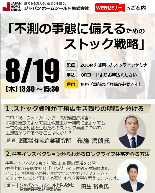 戸建住宅の建物検査・地盤調査を手掛けるジャパンホームシールド株式会社(所在地:東京都墨田区、代表取締役社長:斉藤武司、以下JHS)は工務店向けのWEBセミナー「不測の事態に備えるためのストック戦略」を8月19日(木)に開催します。