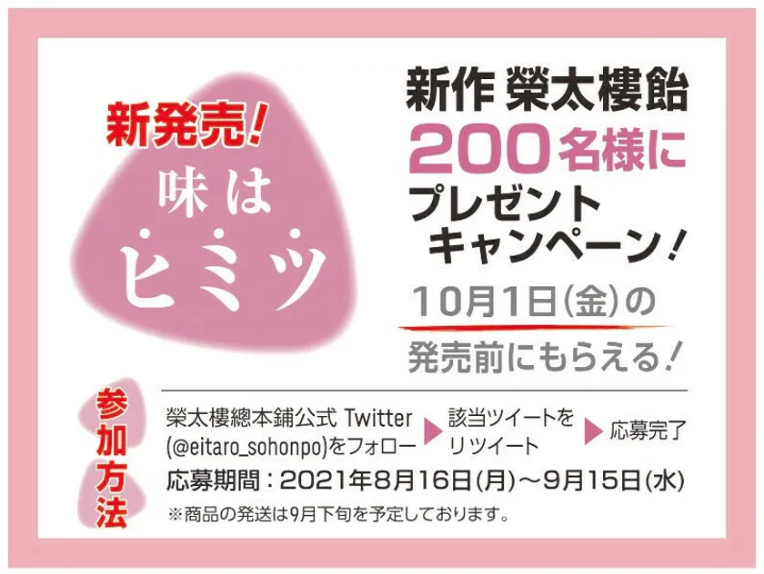 株式会社榮太樓總本鋪(本社:中央区日本橋、代表取締役社長:細田 眞、以下「榮太樓總本鋪」)は、5年ぶりとなる新作榮太樓飴の発売を記念して、抽選で200名様に発売前の新作をプレゼントするキャンペーンを榮太樓總本鋪公式Twitter( https://twitter.com/eitaro_sohonpo )にて開催します。