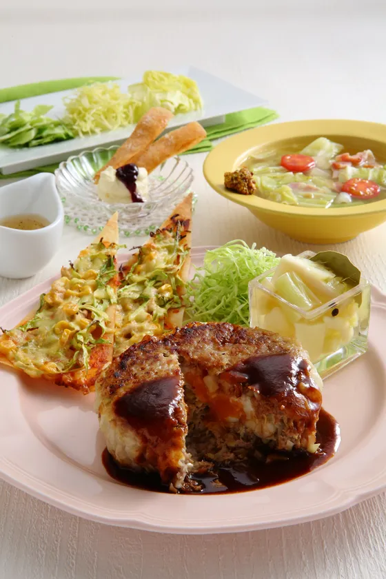 1食(2人分)でキャベツ1/2個を使い切ります。キャベツの芯までおいしく料理に仕上げます。使い切り術を学んでいただくことで、食材ロス削減を目指します。5品作って出る廃棄量は18gだけ!
