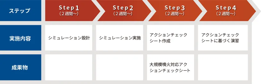 本サービスでは、こうした事態への備えとして、大規模噴火発生時の適切な初動対応について、シミュレーションやアクションチェックシート作成を通じて検討します。これらで得られた学びを既存のBCPに反映することも可能です。