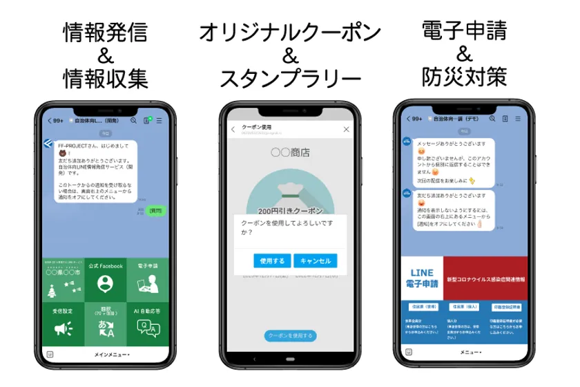 これまで、行政(自治体)でのLINEを使った事例は多岐に渡り、情報発信から始まり、災害対策、子ども・子育て相談、高齢者社会対策、産業振興、住民参加推進、電子申請、鳥獣対策、ごみ減量化、スタンプラリー、地域クーポンなど、住民の皆様を第一とし、ICTを活用した住民サービスの向上を実現してきました。