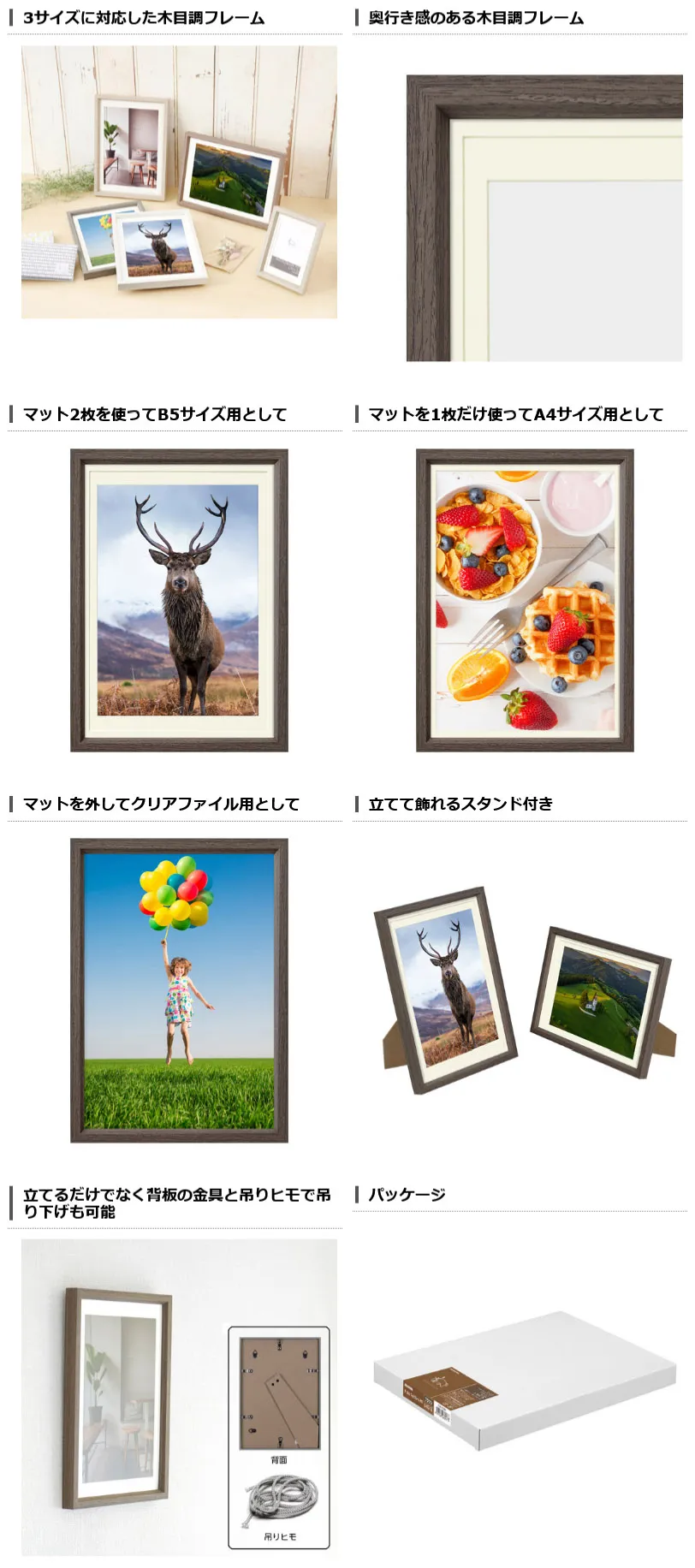 付属のマットを入れ替えることでB5 サイズ、A4 サイズ、クリアファイルの3つのサイズを飾れる3wayフォトフレーム。