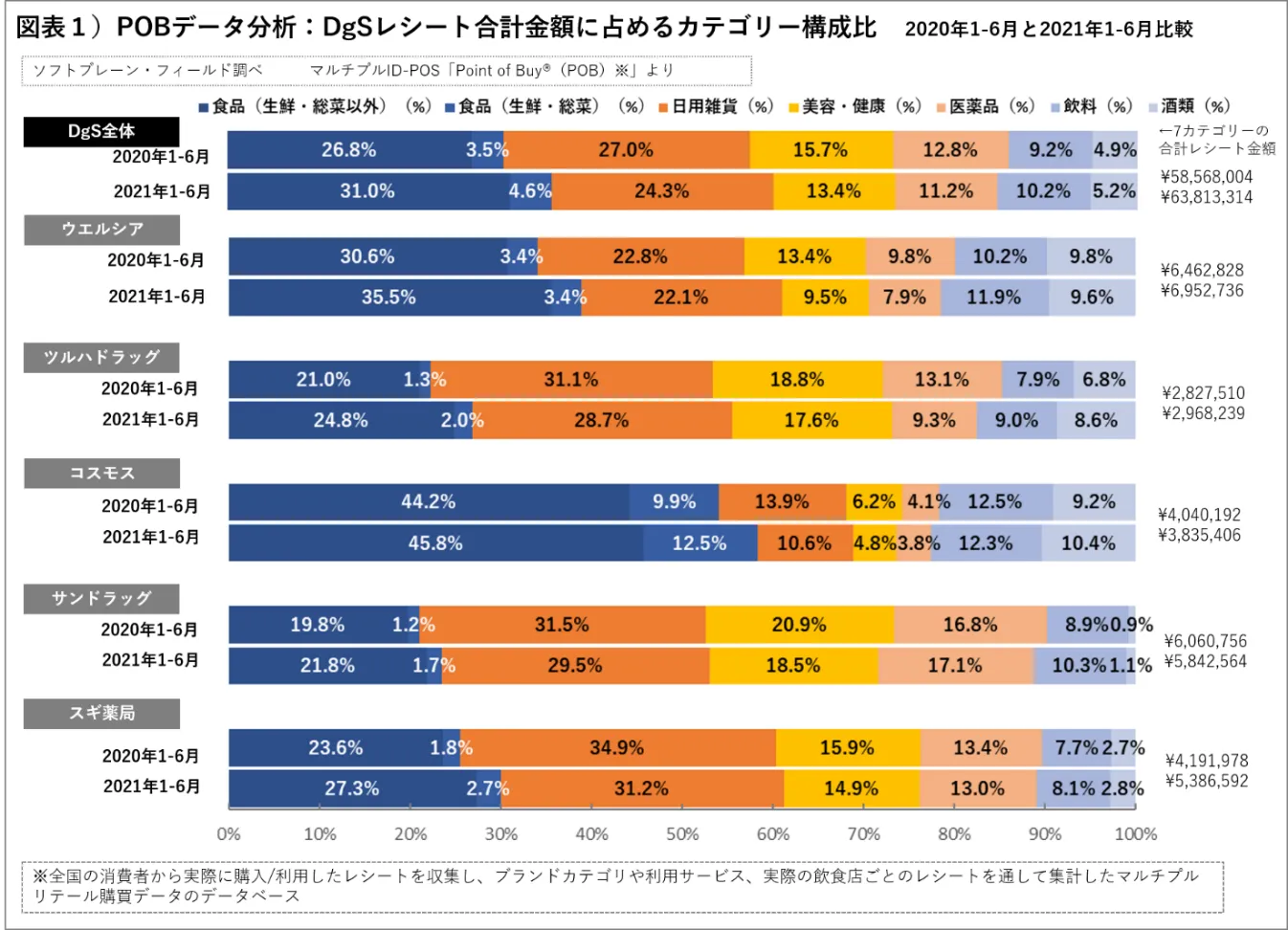 POB会員から収集したレシートデータ(調査期間:2020年1月~6月、DgSレシート枚数 302,697枚、21年1月~6月、DgSレシート枚数 443,536枚)から、まずは、DgS全体および、2020年度DgS売上高ランキング5社(連結ベース)、「ウエルシア(本社東京都:企業名:ウエルシアホールディングス)」、「ツルハドラッグ(本社北海道、企業名ツルハ)」、「コスモス(本社福岡県:企業名:コスモス薬品)」、「サンドラッグ(本社東京都:企業名も同じ)」、「スギ薬局(本社愛知県:企業名スギホールディングス)」のチェーンごとに、レシート合計金額(※)に占める、商品カテゴリー別の構成比を分析しました。※レシート合計金額は、「食品(生鮮・総菜以外)」・「食品(生鮮・総菜)・「日用雑貨」・「美容・健康」・「医薬品※調剤は含まない」・「飲料」「酒類」の7カテゴリーのレシート合計金額です。