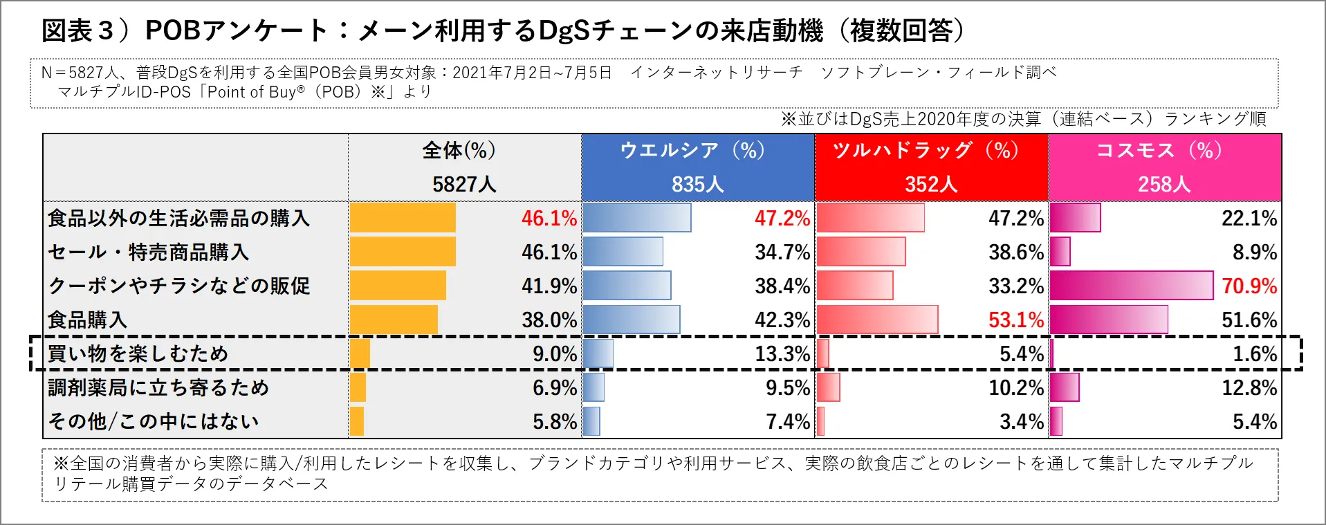 調査結果では、2020年度ドラッグストア売上ランキング5社のチェーン別(ウエルシア、ツルハ、コスモス、サンドラッグ、スギ薬局)のレシート合計金額に占める商品カテゴリ―別構成比、DgSの利用動向アンケート結果(利用頻度・来店動機)、