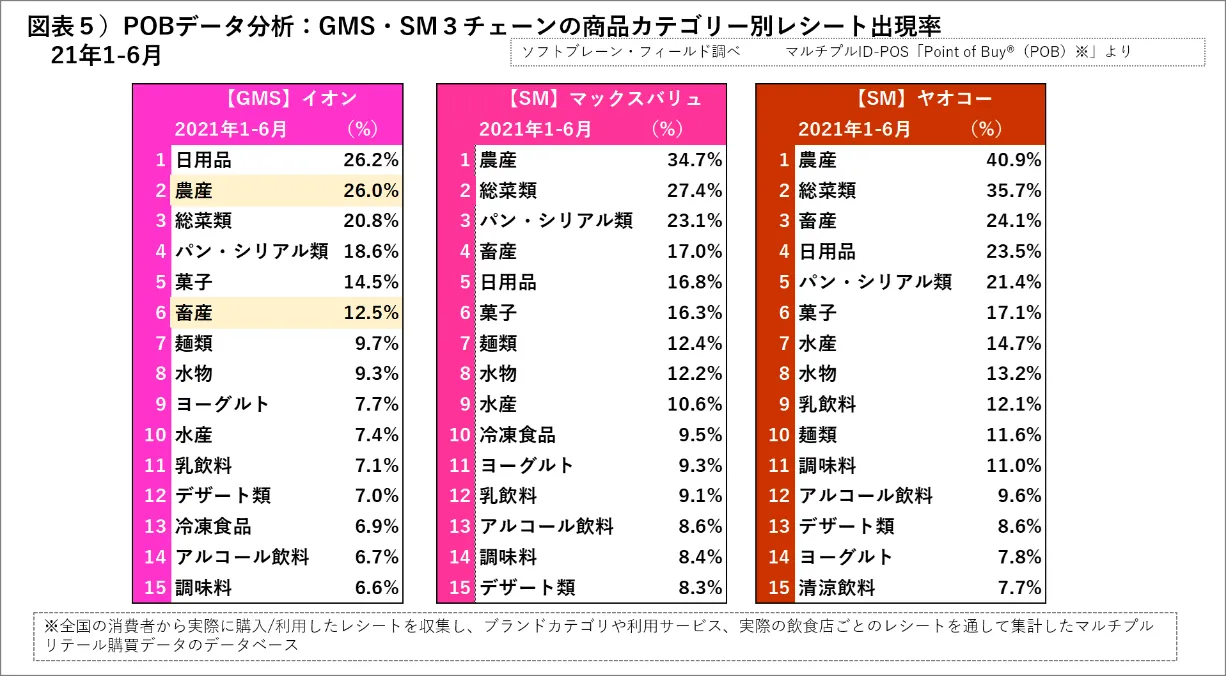 次に、各チェーンどのカテゴリーが購入されているのか、「ウエルシア」「ツルハ」「コスモス」の購入レシート全体のカテゴリー別出現率(購入率)をPOBデータから分析しました(図表4)。今回は、DgSの比較対象として、GMS「イオン」とSM「マックスバリュ」、「ヤオコー」においても同様に図表にまとめました(図表5)。