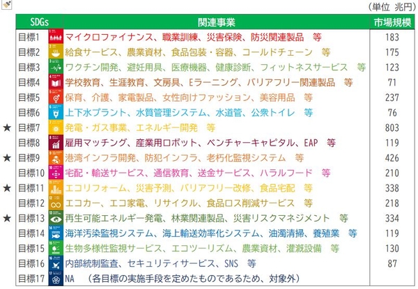 参考:(注4・5)・(上記表)「SDGsビジネス」の市場規模、図4: SDGsは大きなビジネスチャンスをもたらす市場〈SDGsの各目標の市場規試算