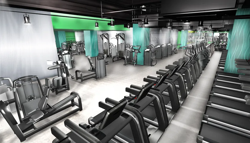 (1) 約120台のマシンを揃えたジムエリアは24時間利用可能です。ジムエリアにはテクノジム社の最新トレーニングマシンやパワーラック、スミスマシン、ベンチプレスなどを揃えたフリーウエイトに加え、未経験者の方でも始めやすいストレッチに特化したマシンなどを揃えています。
