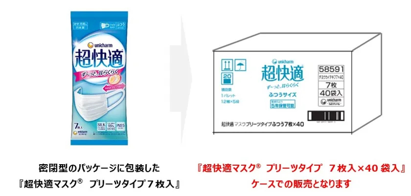 ユニ・チャーム株式会社(代表取締役 社長執行役員:高原豪久)は、2020年の年間売上金額・枚数ともに1位※の『超快適マスク(R)』ブランドから、密閉型のパッケージに包装し、5年間の長期保管が可能な『超快適マスク(R) プリーツタイプ 7枚入×40袋入』を、2021年8月10日より全国で発売します。