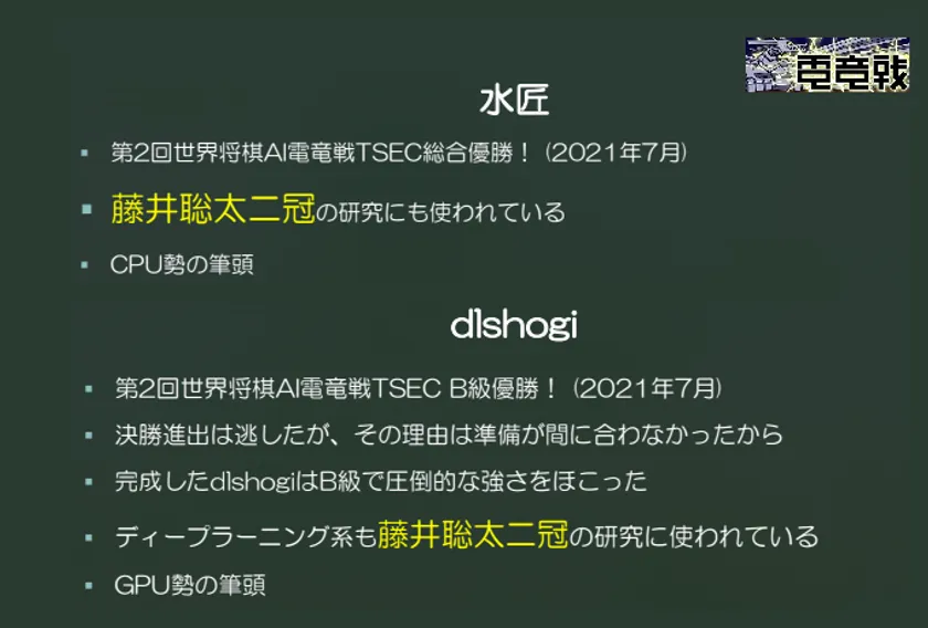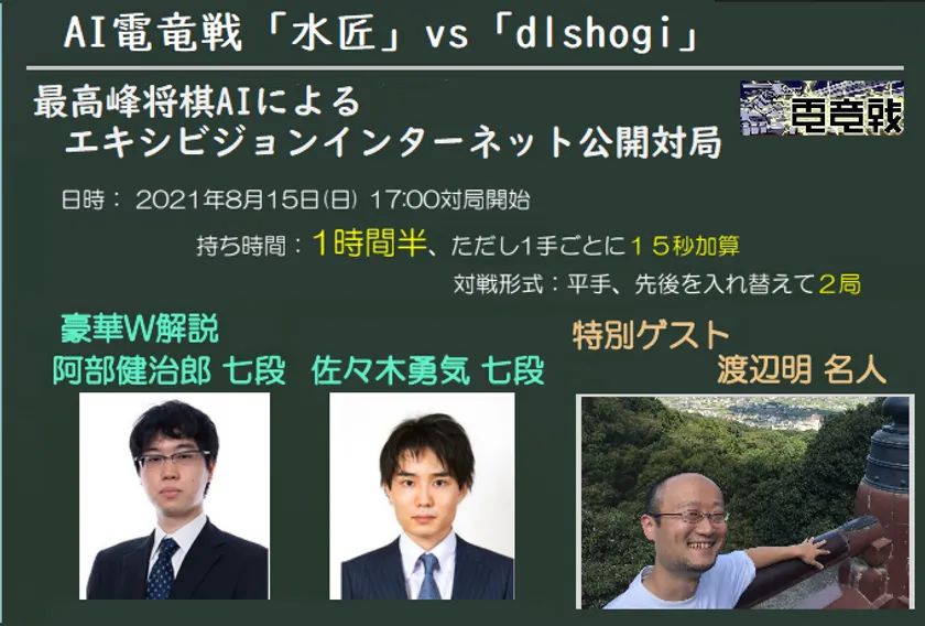 最高峰将棋AIによるエキシビジョン公開対局 “AI電竜戦「水匠」vs「dlshogi」”2021年8月15日開催! 解説にプロ将棋棋士2名、ゲストは渡辺名人