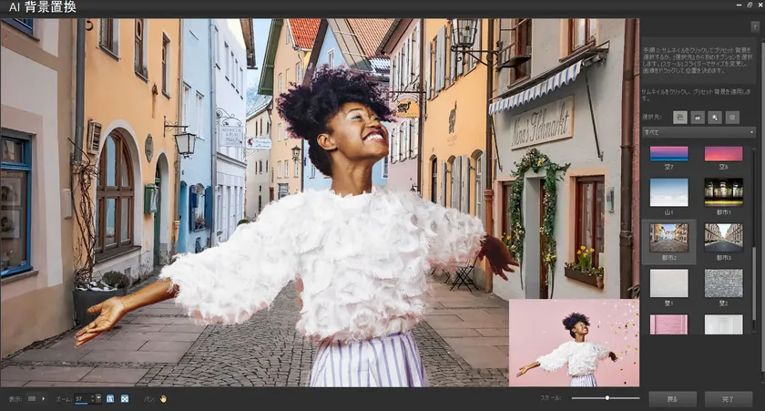 ● 新機能!AI背景置換:画像の背景を瞬時に変更できます。新しいAI背景置換ツールは、写真内の人物をインテリジェントに検出してマスクを適用し、背景をシームレスに置き換えて、様々な背景、配色をあてはめてみることができます。