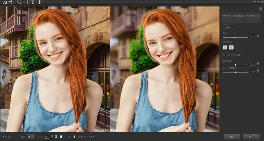 ● 新機能!AIポートレート モード:PaintShop Pro のイマーシブ技術により、背景を自動的に分析して、ボケ味を適用します。ヘッドショットでは、背景をやわらかくぼかすことで、画像の焦点を被写体に合わせることができます。