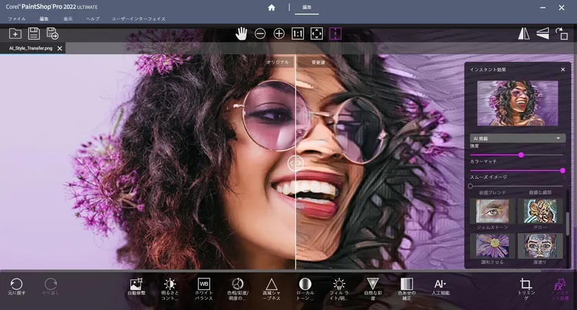 ● 機能強化!AIスタイル変換:スタイル変換の技術が進化し、画像にさらに芸術的な特徴を加えることができるようになりました。カラーマッチとスムーズ イメージのオプションが新たに加わり、スタイルを適用した画像をより自由にコントロールし、ディテール、テクスチャ、カラーをよりよく調整できます。