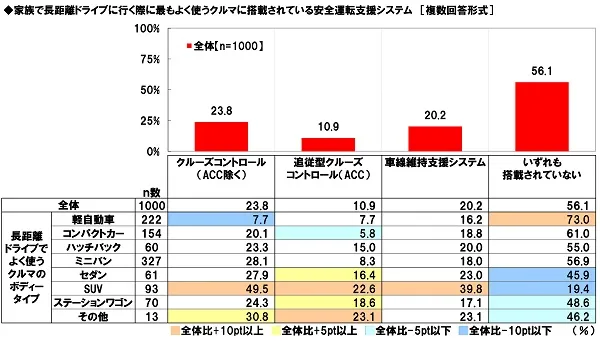 全回答者(1,000名)に、家族で長距離ドライブに行く際に最もよく使うクルマに搭載されている安全運転支援システムを聞いたところ、「クルーズコントロール(ACC除く)」は23.8%、「追従型クルーズコントロール(ACC)」は10.9%、「車線維持支援システム」は20.2%となりました。