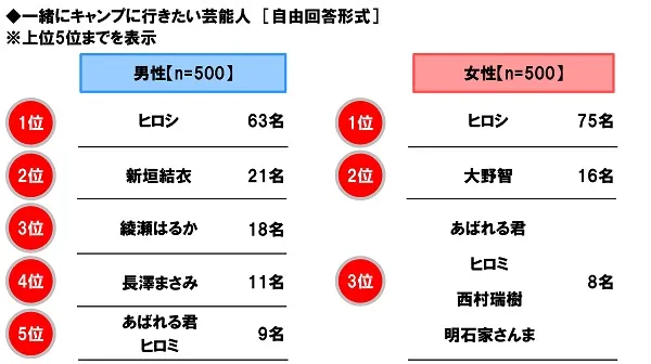 ■一緒にキャンプに行きたい芸能人 「ヒロシさん」がダントツ、女性回答では「大野智さん」が2位に