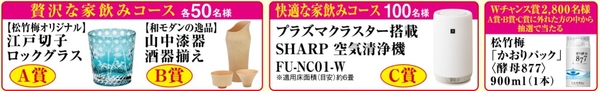 2,000円分を一口としてご応募いただくと、A賞(江戸切子ロックグラス:50名様)、B賞(山中漆器酒器揃え:50名様)、C賞(プラズマクラスター搭載SHARP空気清浄機:100名様)の中から抽選でご希望の賞品が当たります。さらに、A賞・B賞・C賞に外れた方の中からWチャンス賞(松竹梅「かおりパック」<酵母877>900mlパック1本:2,800名様)を抽選でプレゼントする総計3,000名様に当たる消費者キャンペーンです。