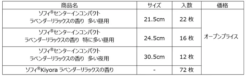 そこでこの度、心地よい香りでストレスや疲れを癒してくれる、ラベンダーの香りを採用した『ソフィ(R)センターインコンパクト1/2・Kiyora ラベンダーリラックスの香り』を発売します。