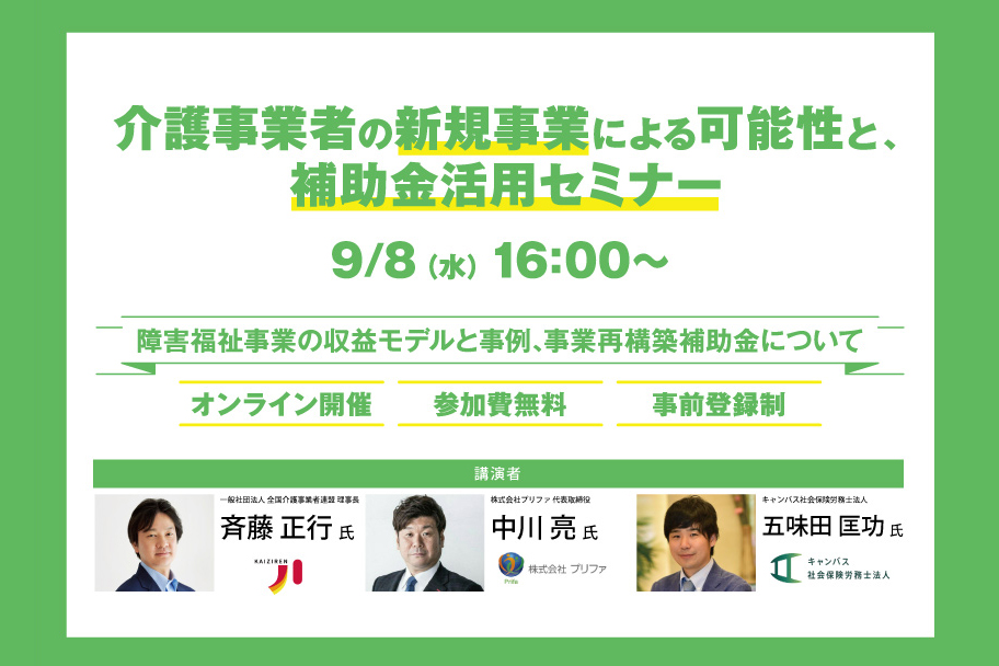 「介護事業者の新規事業による可能性と、補助金活用セミナー」 9月8日(水)にオンライン開催