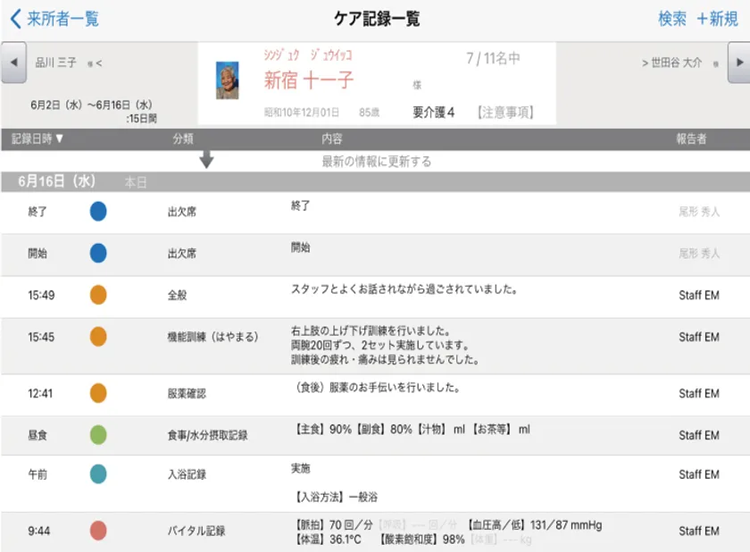 お世話をした利用者様の目の前でボタンと音声だけで簡単にケア記録を作成し、そのデータを通信状態の良いところで送信することで、サーバー上のデータを更新、パソコンや他のiPadで情報を共有することができます。さらに、記録された情報はそのまま直近の健康管理情報になり、グラフ表示等で素早く変化を読み取ることもできます。例えば通所版においては出欠席や入浴・機能訓練を「ファーストケア」側で実績連動する事が可能です。別途Bluetooth連携のバイタル機器を使えば計測した値を自動で入力する事が出来ます。