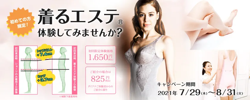 プロポーションづくりの総合コンサルティング企業、株式会社ダイアナ(東京都渋谷区、代表取締役社長兼会長:徳田 充孝、以下 ダイアナ)が、ダイアナを初めて体験する方限定の「着るエステ(R)体験」キャンペーンを2021年7月29日より開始しました。