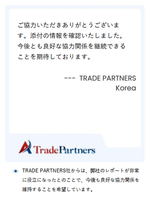 「ご協力いただきありがとうございます。添付の情報を確認いたしました。今後とも良好な協力関係を継続できることを期待しております。」