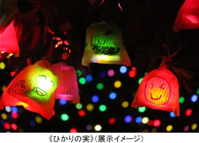 笑顔が描かれた果実袋の中に、LEDの小さな光を入れて膨らませて作る光の作品です。約3,000個の「ひかりの実」を樹木に取付けて飾ります。一人ひとりが参加することによって夜景が作られ、沢山の笑顔と癒しの風景を木々の間や池の畔に創る作品です。