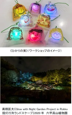 照明や映像を巧みに操って光の可能性に挑んでいるアーティスト、高橋匡太による音や光とコラボレーションした参加型の代表作2作品《ひかりの実in SIKIガーデン》と、《Glow with Night Garden Project in Rokko提灯行列ランドスケープ》を六甲山上で同時に楽しむことができます。《ひかりの実in SIKIガーデン》は会期中だけでなく事前に展示会場やオンラインでもワークショップを行います。会期中はライブ配信を行うなど、遠方の方も含めた多くの方に参加・鑑賞いただける作品です。