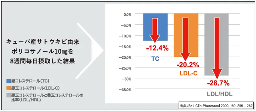 キューバ産ポリコサノールは約120編のSCI級論文を通じて、その機能性と安全性が確立されています。2010年のキューバ国立科学研究所で行われた人臨床試験で健常者を対象に8週間キューバ産ポリコサノールを毎日10mgずつ摂取した結果、総コレステロール(TC)が12.4%減少し、悪玉コレステロール(LDL)の数値が20.2%減少し、心血管疾患の重要な予測因子であるLDLとHDLの比率は28.7%改善しました。