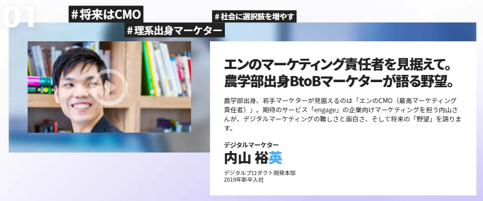 オンライン中心の選考においても社風や入社後のキャリアをイメージしていただけるよう、「動画」の社員インタビューや「エン・ジャパン職種図鑑」といった新しいコンテンツも充実させました。また、採用メッセージ「正義が儲かる世界を創ろう。」を軸に、実現したいビジョン、拡大を続けるビジネス領域、手がけたプロジェクトのストーリーも紹介しています。