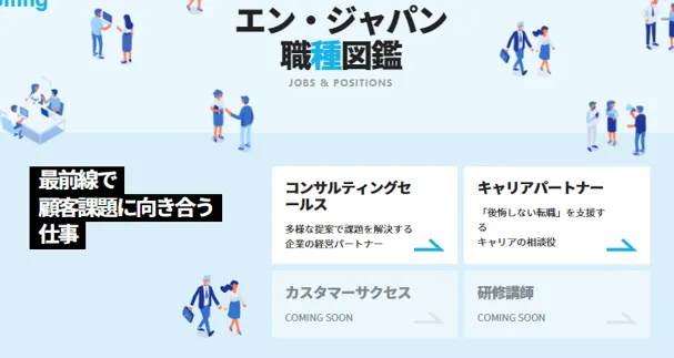 「エン・ジャパン職種図鑑」では、デジタルマーケター・データアナリストなど学生からはイメージしづらい職種も紹介。社内公募制度で実現した職種転換の具体例からは、入社後のキャリアをイメージしていただけます。