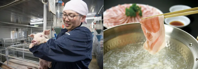 左:佐助豚に愛を注ぐ3代目の久慈社長、右:佐助豚イメージ